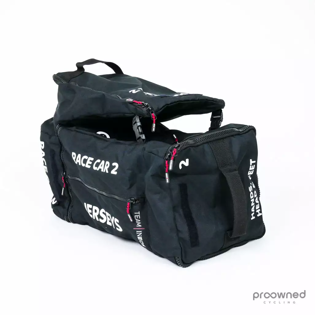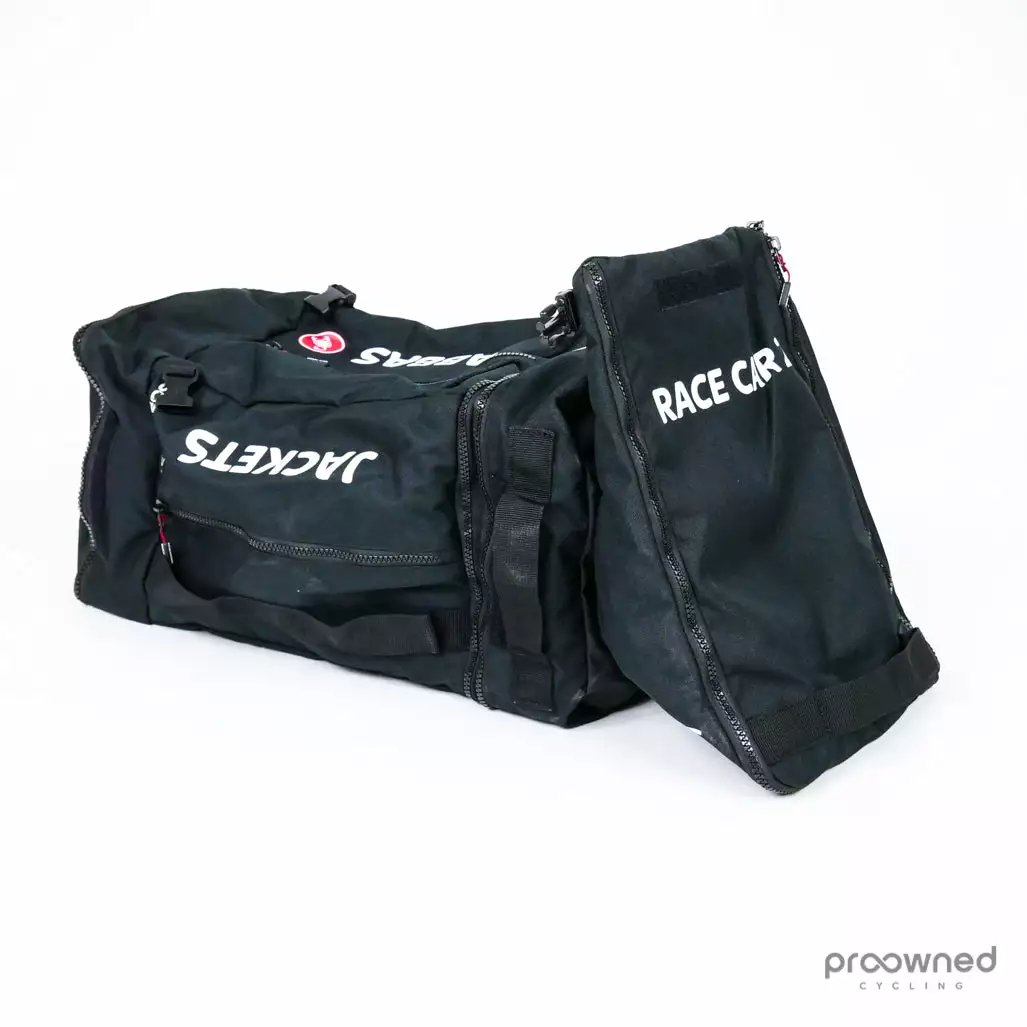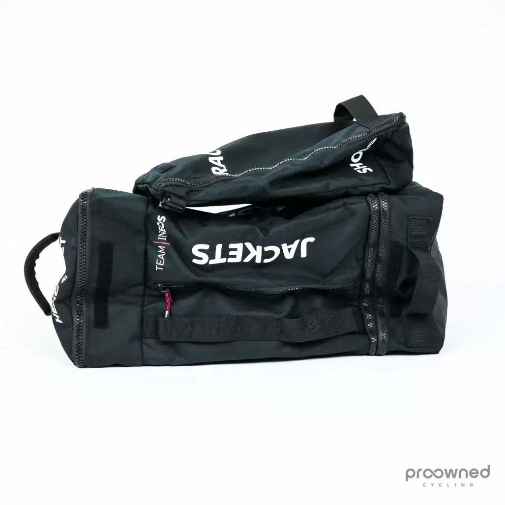 The race rain bags are used by the team for races and are stored in the team car behind the peloton. The race bag is used for essentials for each rider to use during a race.