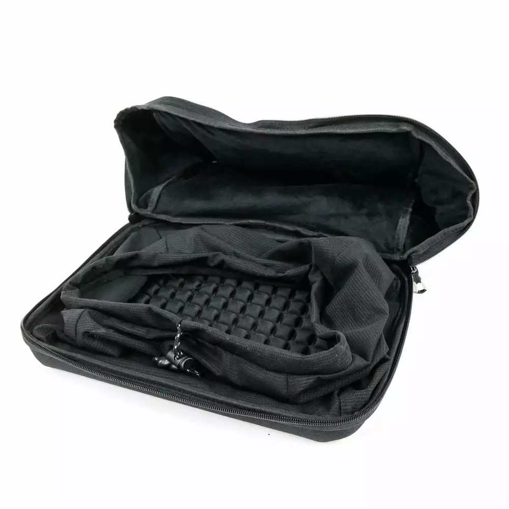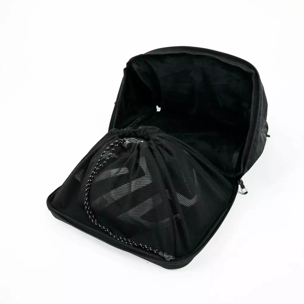 The Helmet bag can contain one time-trial aero helmet, a mountain bike helmet, or two road cycling helmets. The large main compartment with a rigid base and padded sidewalls is equipped with an internal mesh drawcord retainer that fastens your helmet in place and keeps it secure from shocks and scratches.