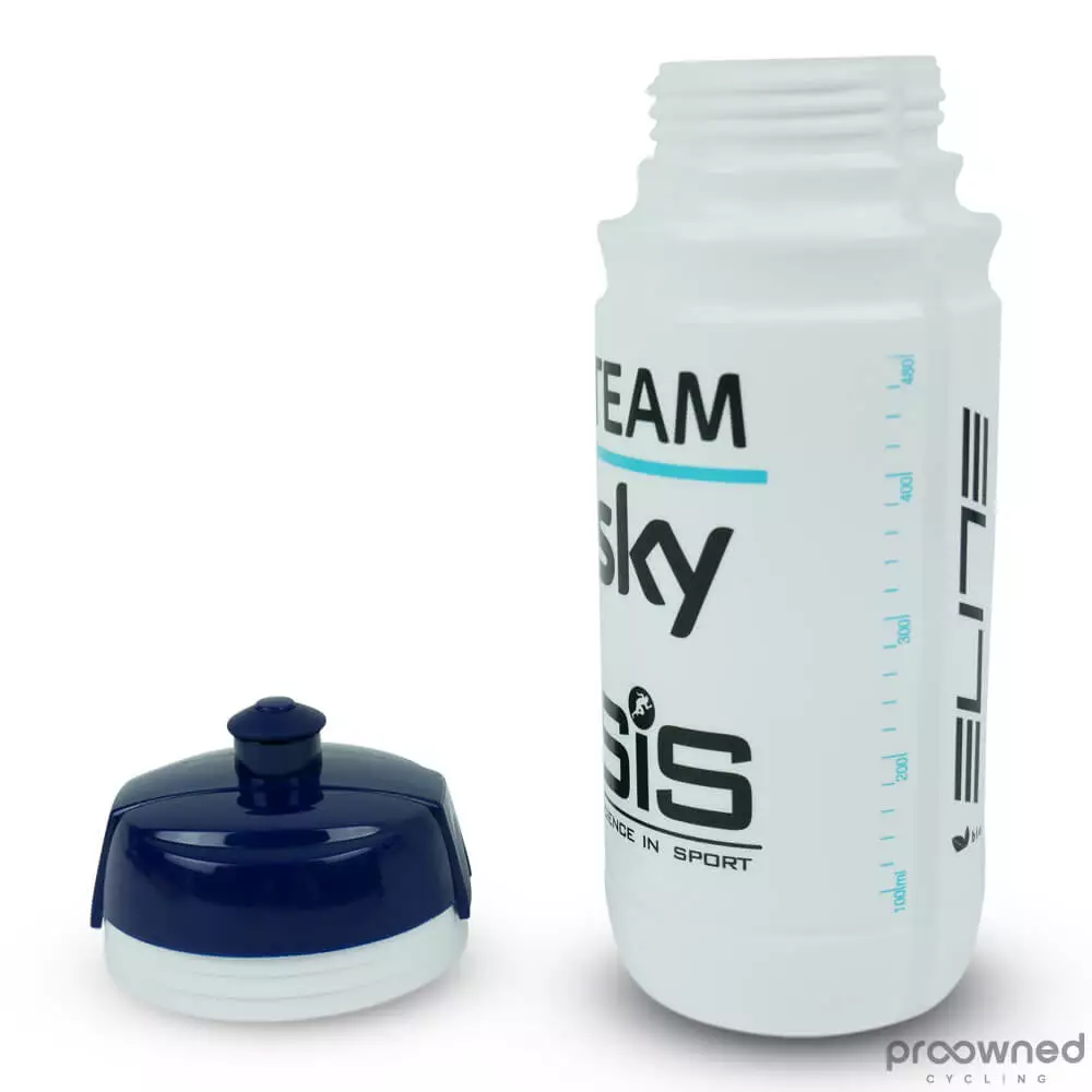 Elite Corsa Team Sky 550 ml bottle is one of the sports most used water bottles. This type of bottle is used by the best professional World Tour teams. This is the original Bottle directly from the World Tour Team – This is not a replica model.
